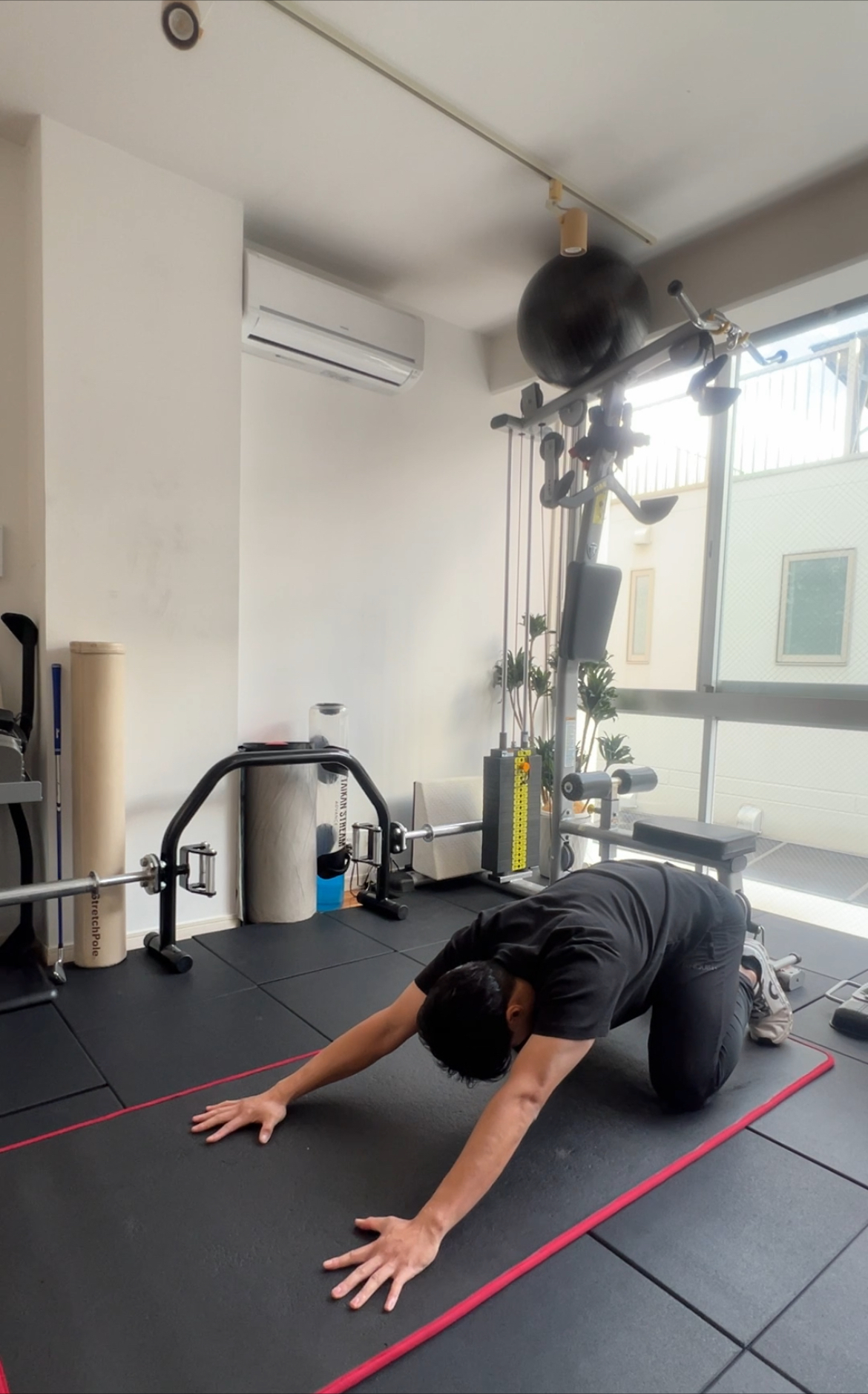 • マットに四つん這いになり、膝を肩幅程度に開きます。