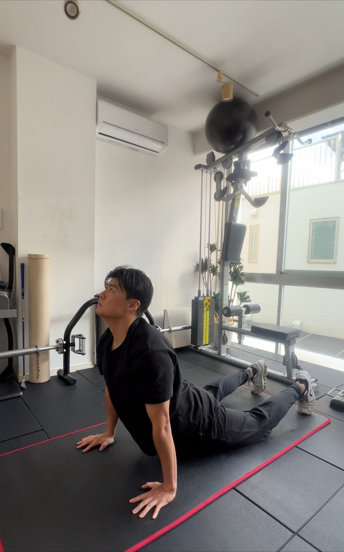 • うつ伏せの状態から両手を肩の下に置き、床を押して胸を持ち上げます。