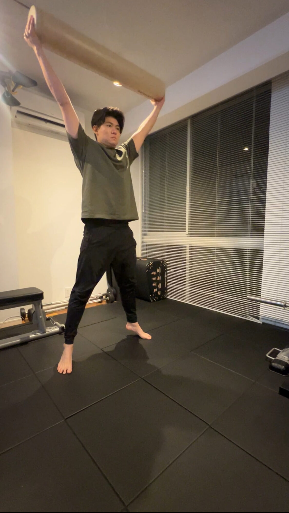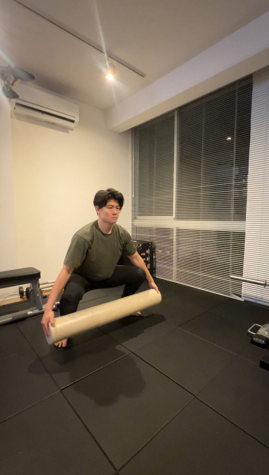 **フォームローラーを使った「スクワット+カーフレイズ」**を導入しています。