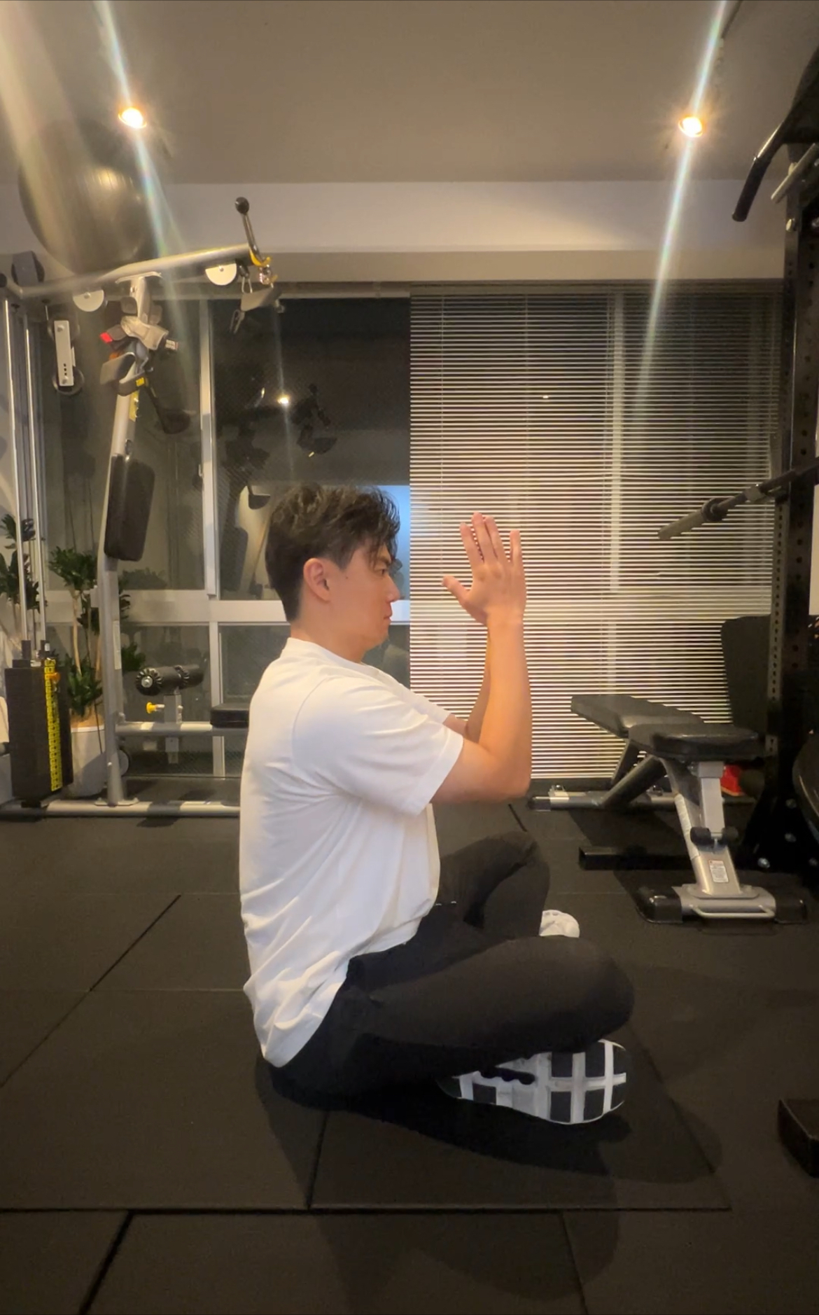 前腕、肘、手のひらをピタッとくっつけたまま、ゆっくりと両手を上げます。