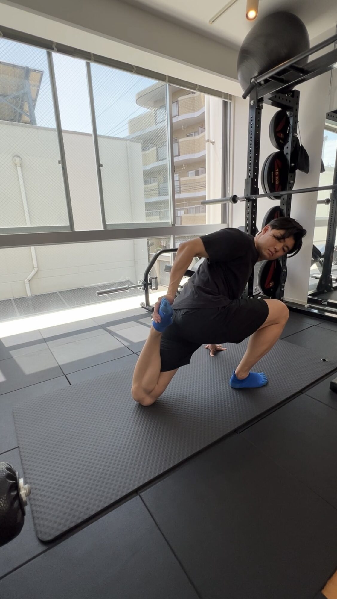 - 左足をお尻のほうにグッと引き寄せて、太ももの前側をじわーっと伸ばします