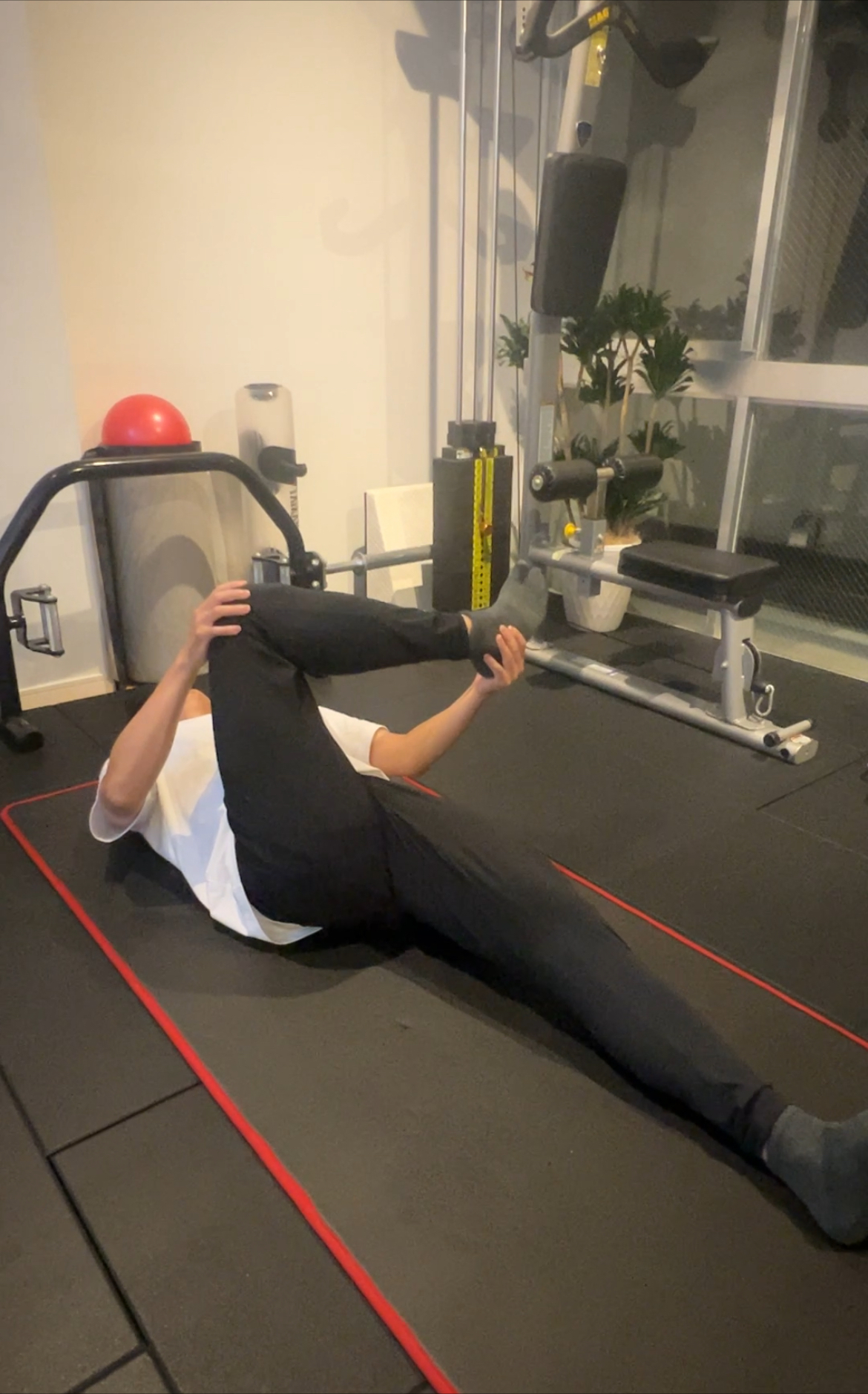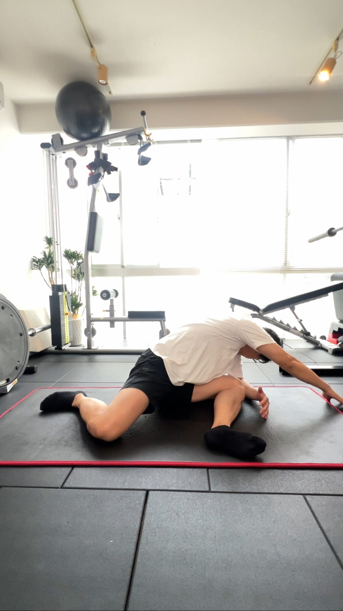 ③ 足は両方90度で卍の形をイメージ。体を横に広げるようにしてお尻の外側をストレッチ。