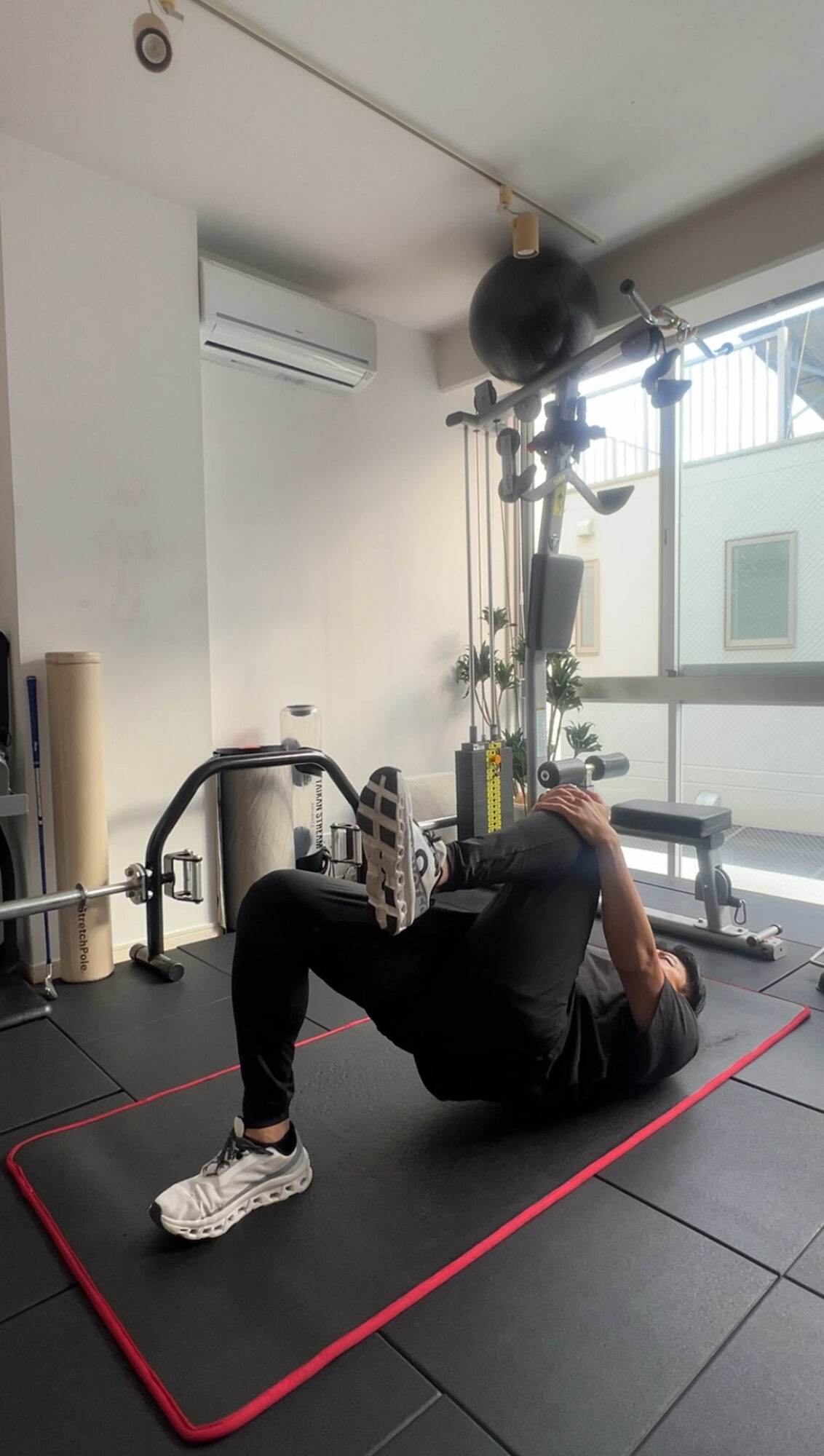 ②床についた脚のかかとで地面を押しながらお尻を持ち上げる。