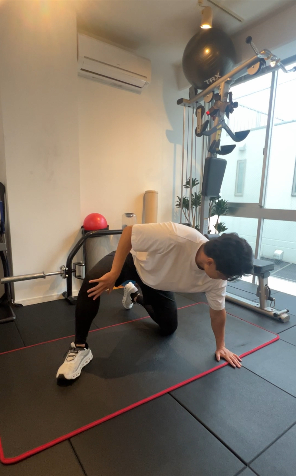 手で膝を外側へ押しなから上半身を反対側へ捻る