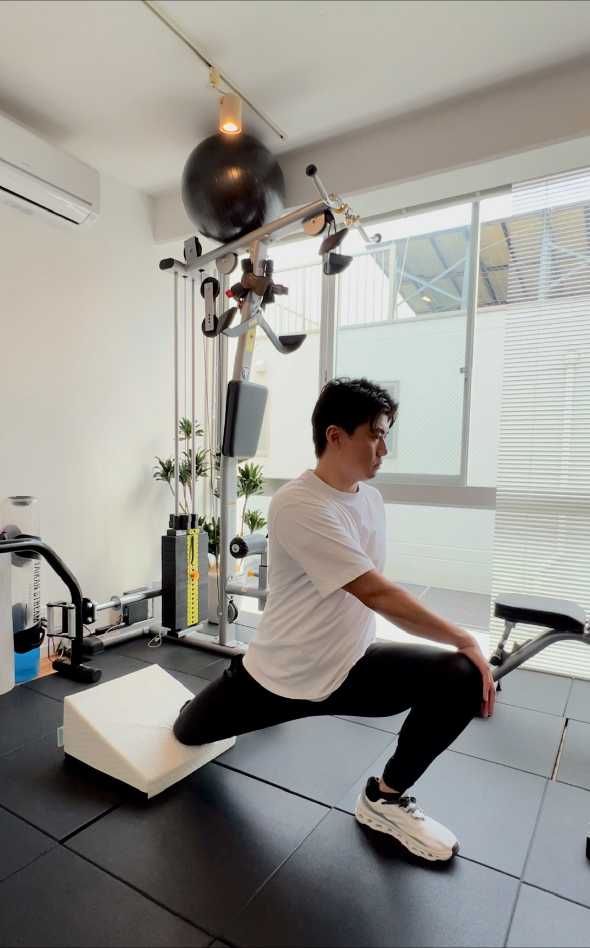 背筋をしっかりと伸ばし、骨盤を立てるように意識しましょう。上体をまっすぐ保つことで、股関節周りの筋肉が効果的に伸びます。 - 前方に体重を移動