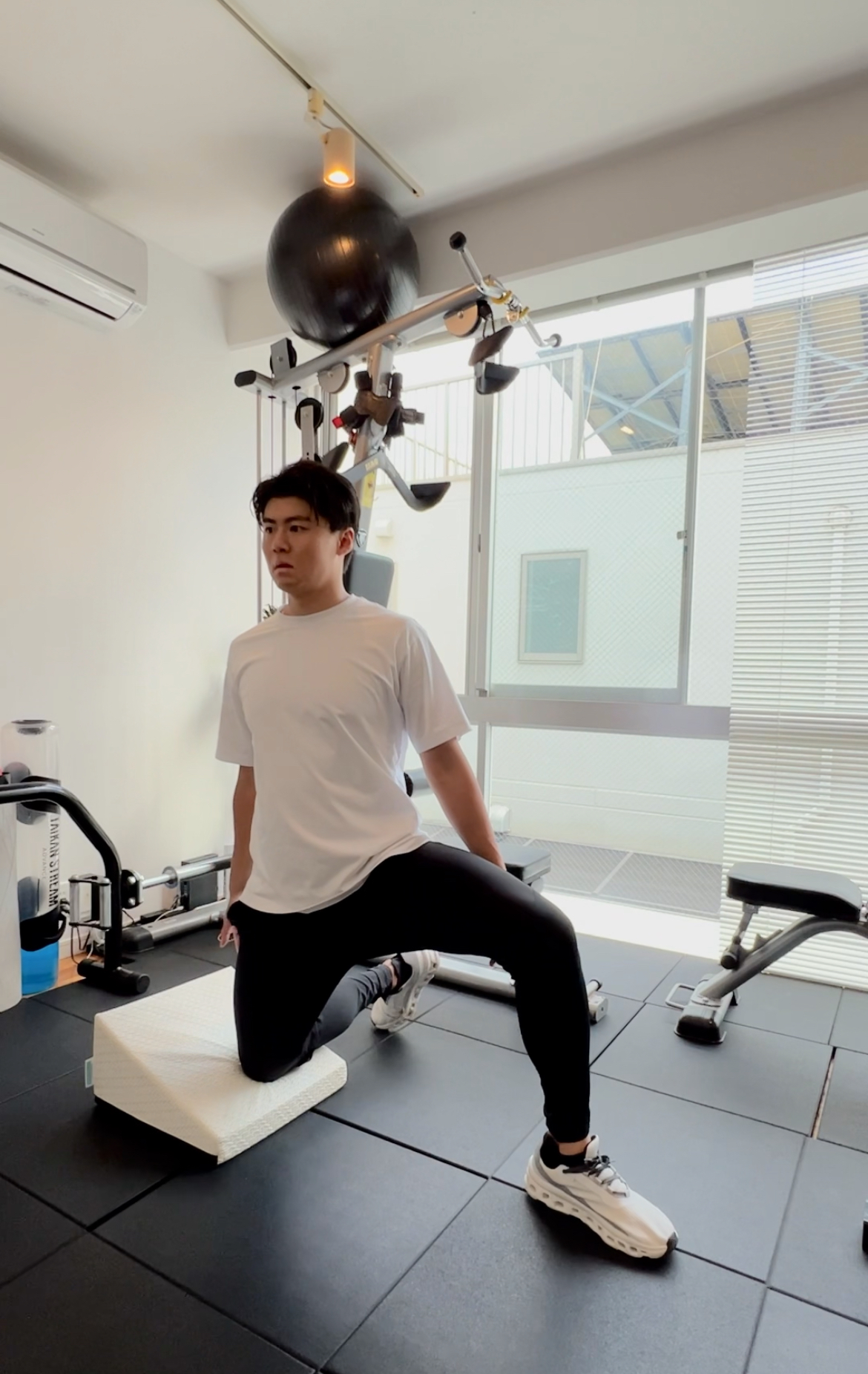 床に片膝をつき、もう片方の足を前に出し、膝を90度に曲げます。後ろの膝の下にクッションを置くと膝への負担が減り、快適に行えます。 - 背筋を伸ばす