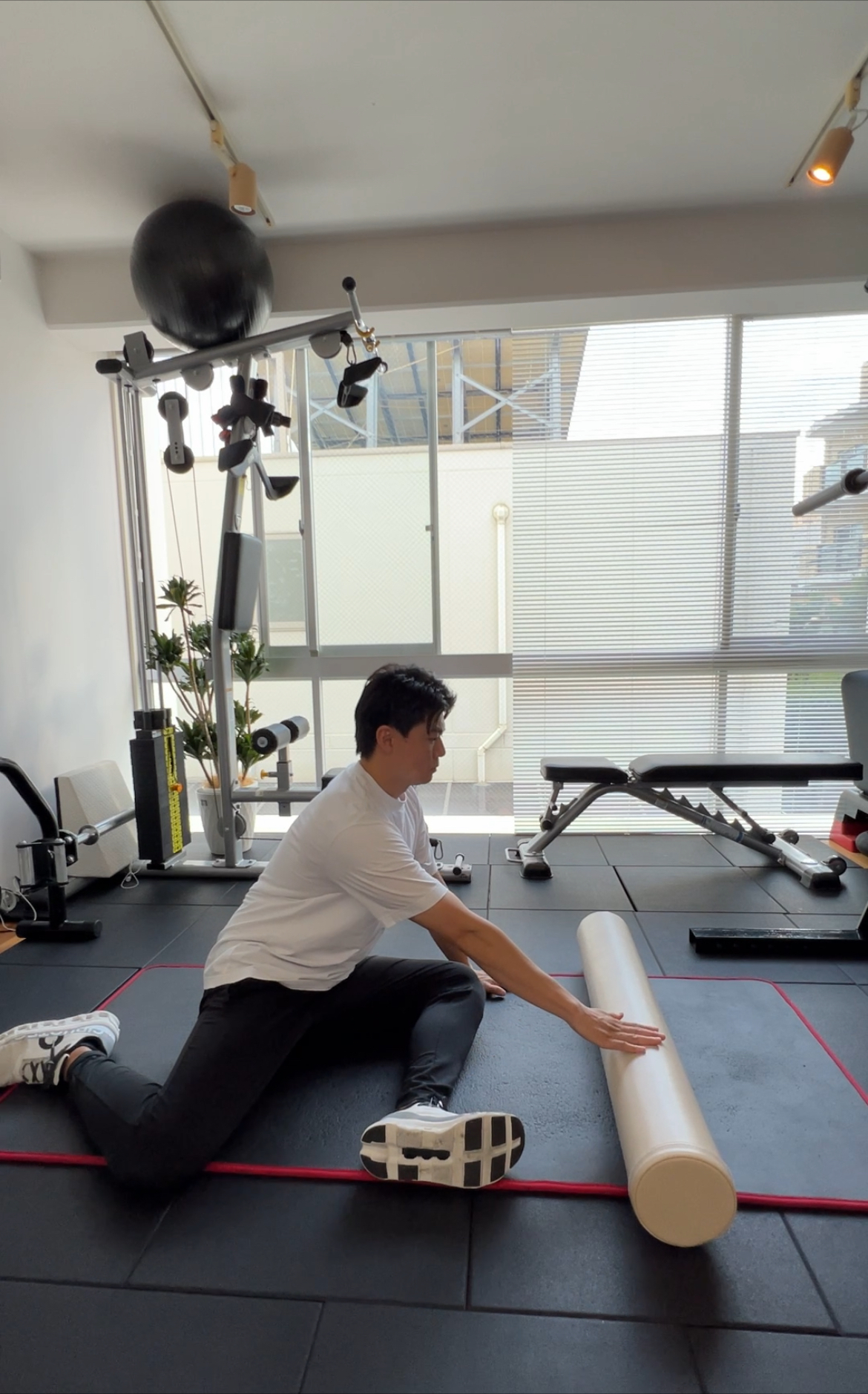 1.床に座り、片脚を曲げて、反対の脚を後方に伸ばします。