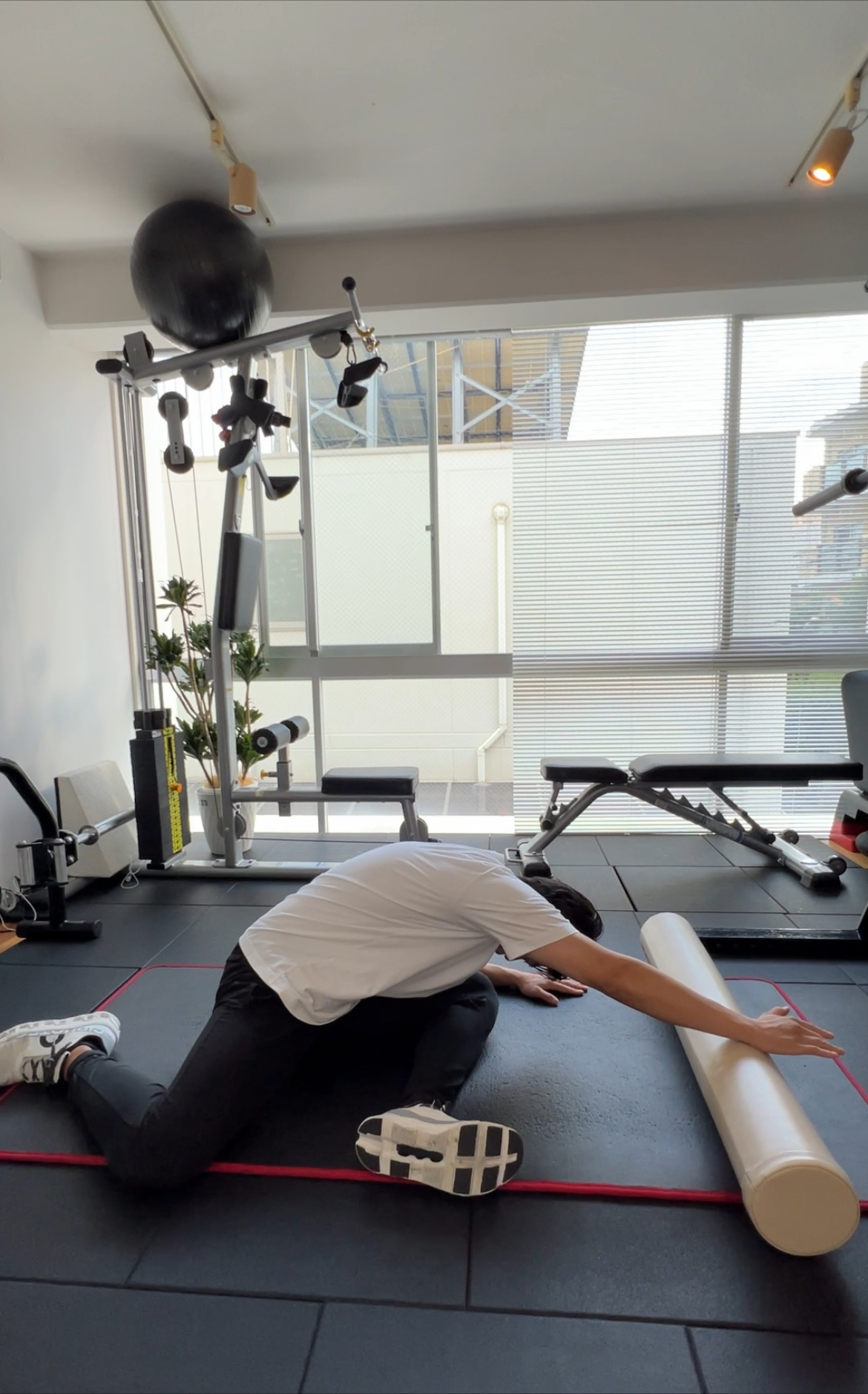 2.ストレッチポールやクッションを前方に置き、両手で軽く支えます。
