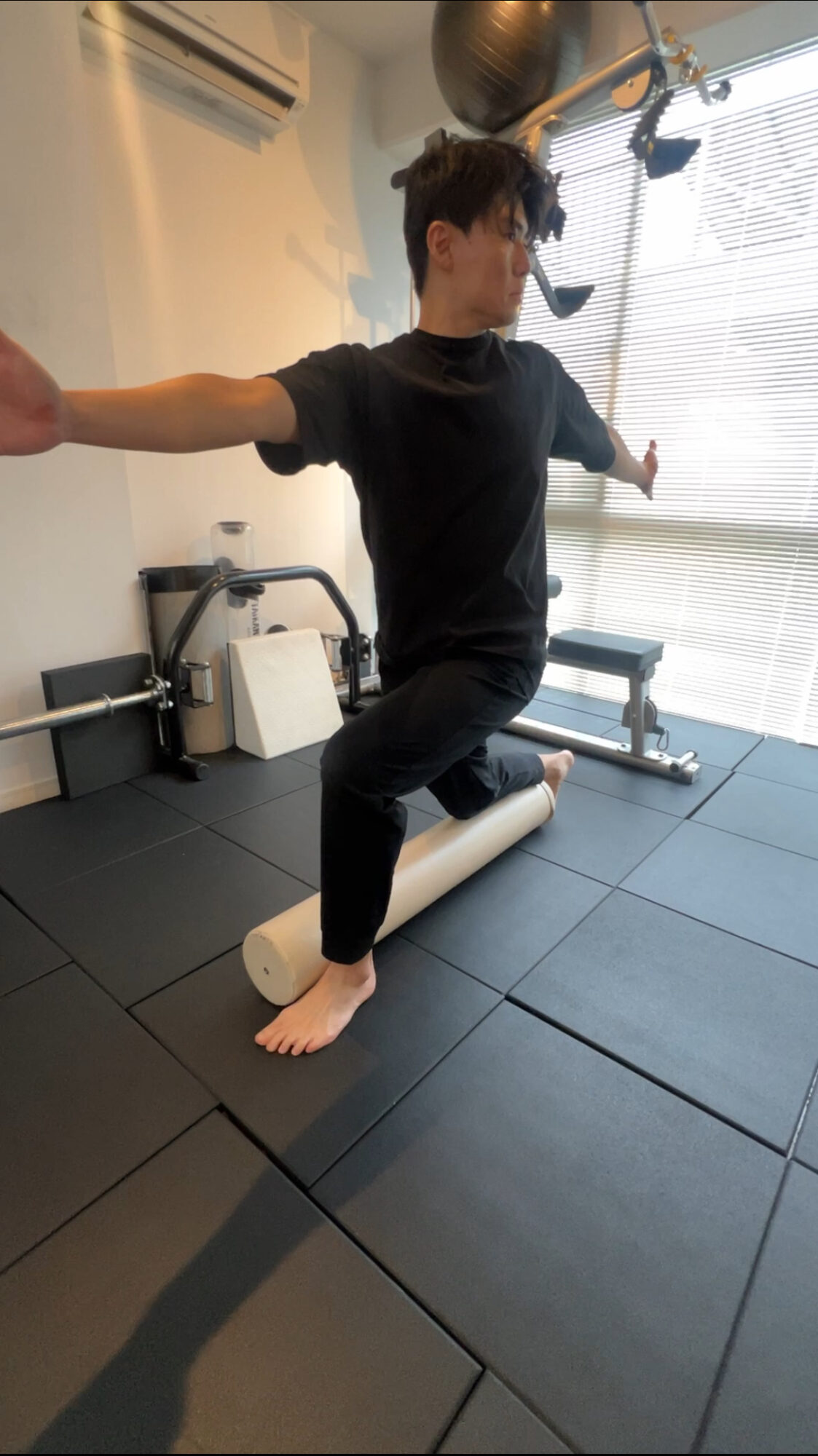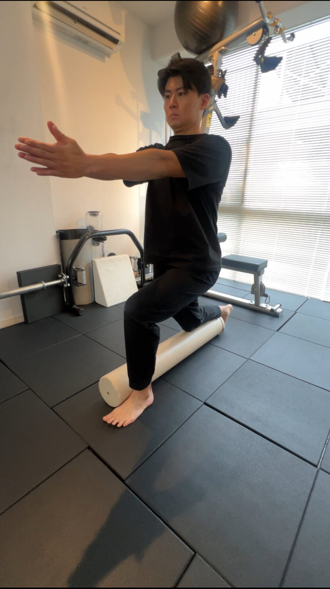 • フォームローラーの上に片足を乗せ、ランジポジションを取ります。