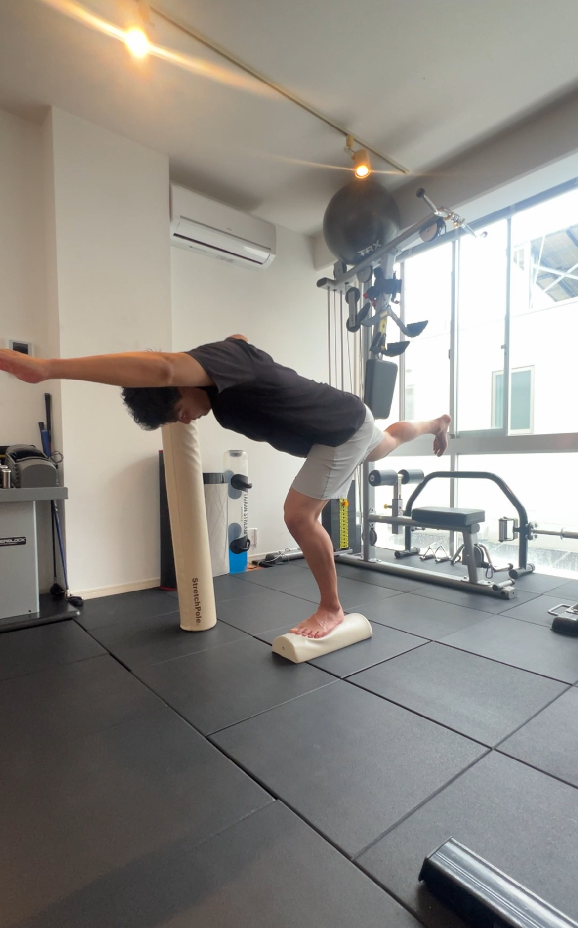 写真のように、片足でストレッチポールに立ち、もう片方の膝を曲げて上げます。両腕を広げ、体が安定するようにします。