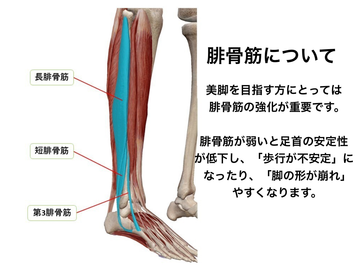 特に女性の場合、ハイヒールや長時間の立ち仕事によって、腓骨筋が使われにくくなったり、逆に過剰に使われて硬くなったりすることがあります。そのため、この筋肉をしっかりと鍛え、柔軟性を保つことが美脚作りに重要です。