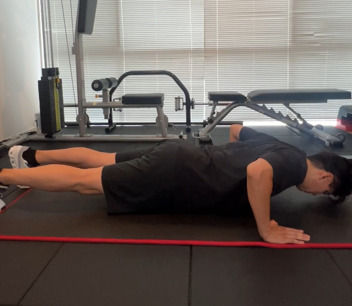 - 床にうつ伏せで寝転がり、両手を肩幅より少し広めに置きます。