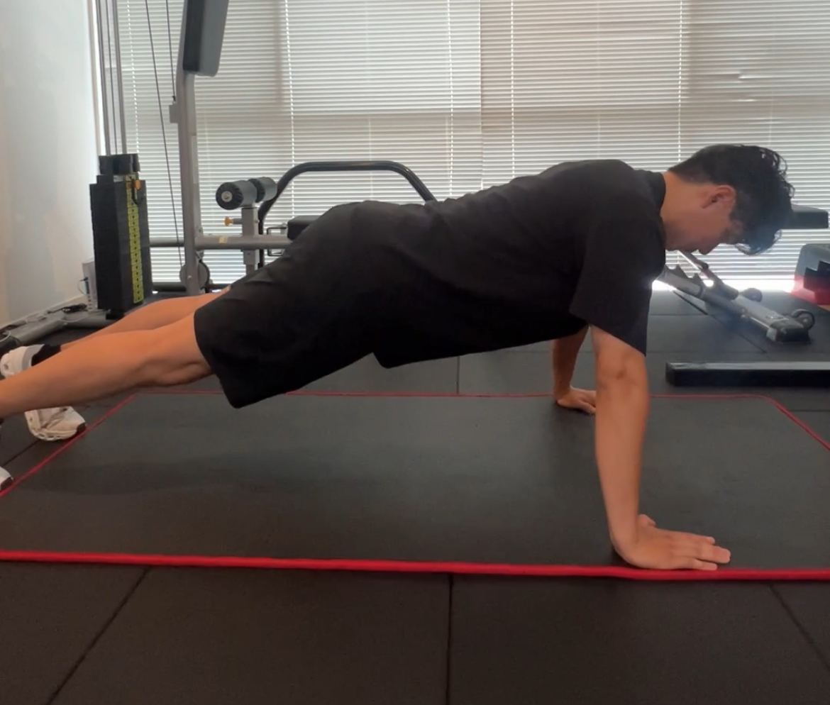- 体を下ろす: 肘を曲げながら、ゆっくりと体を床に近づけます。このとき、胸が床に触れる寸前で止めます。