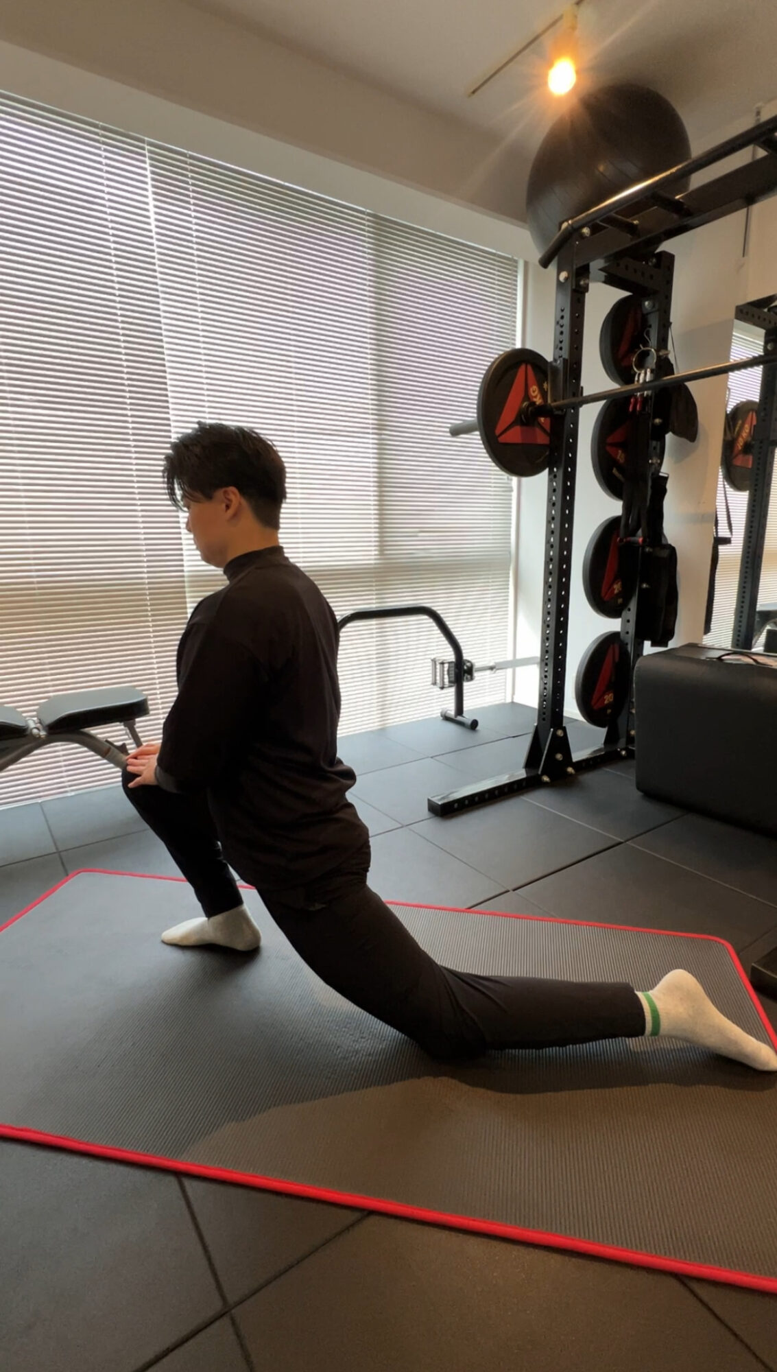 - 骨盤を前にスライドし、前側の股関節を伸ばす