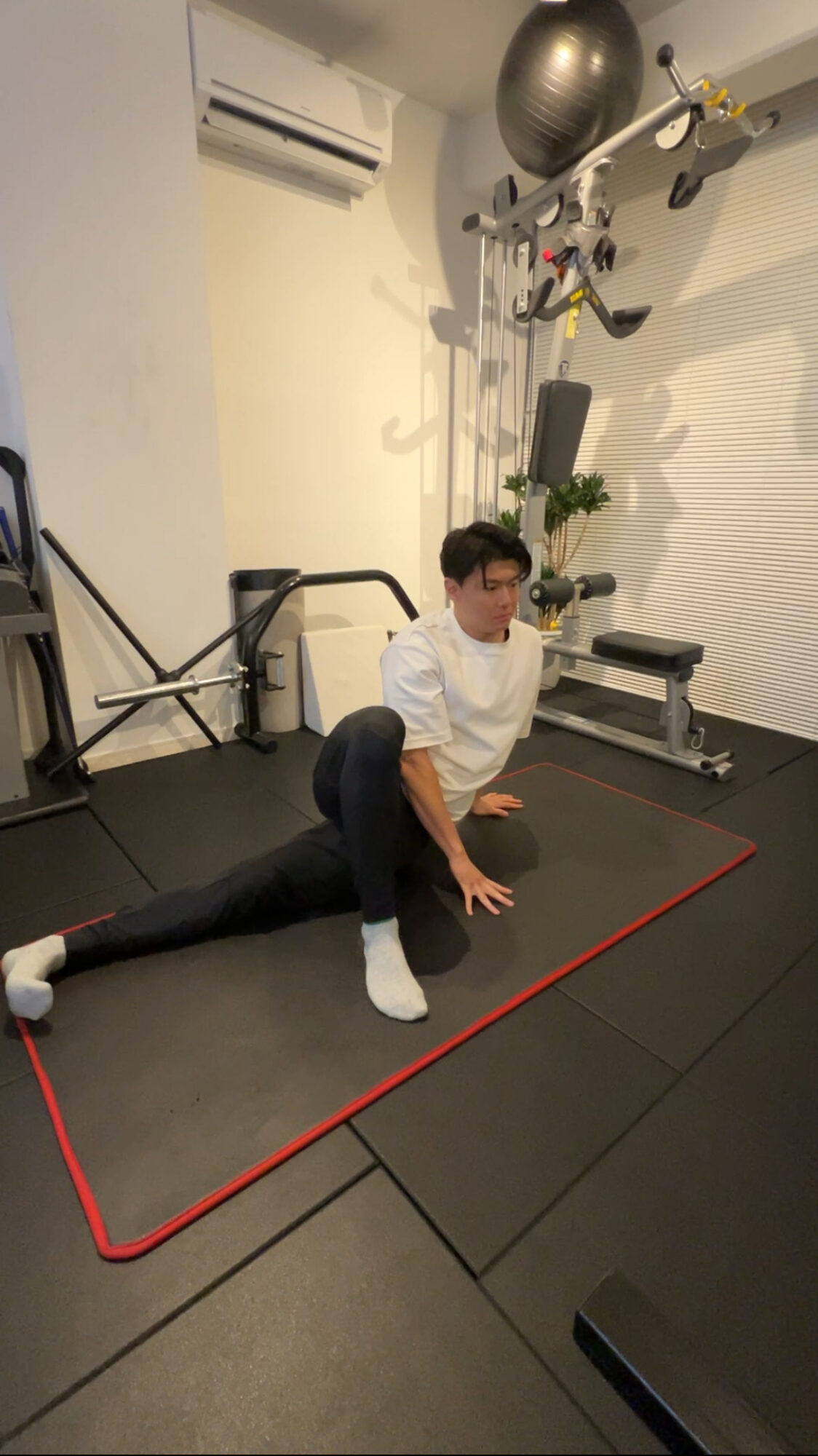 - 座る:床に座り、片足を伸ばし、もう片方の膝を曲げてクロスさせる。