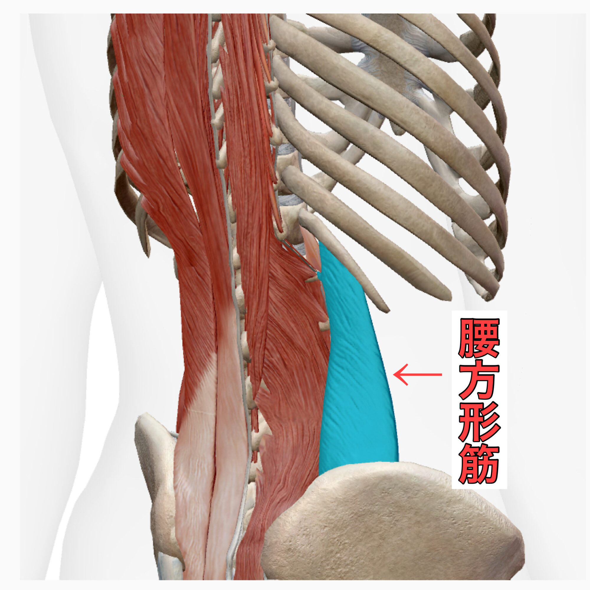 腰方形筋は、腰の深部にあるインナーマッスルのひとつで、背骨の腰椎と骨盤(腸骨)をつなぐ筋肉です。