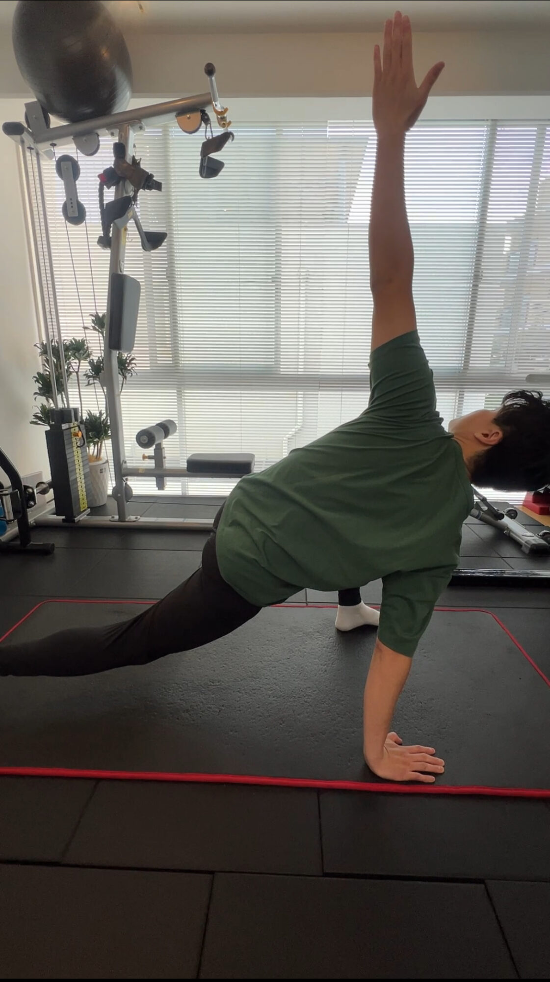 - 上半身をひねり、胸を開く(前脚側の手を天井に向けて伸ばす)